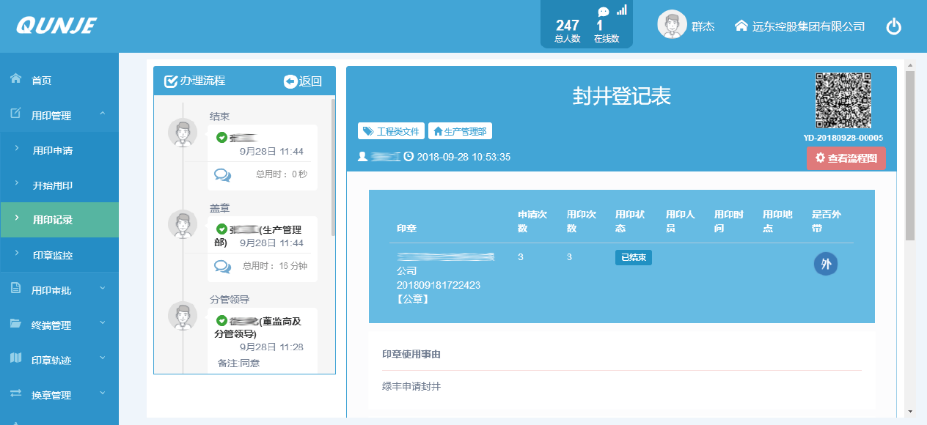 远东采用总部印章集中管理模式,经常需要印章外借使用,而异地分子公司的印章自己管理,风险很难实时把控,且每天的用印量极大,高达4000次以上,给印章管理部门和工作人员带来了巨大的压力。一旦出现审核疏漏,可能给企业带来巨大的风险。