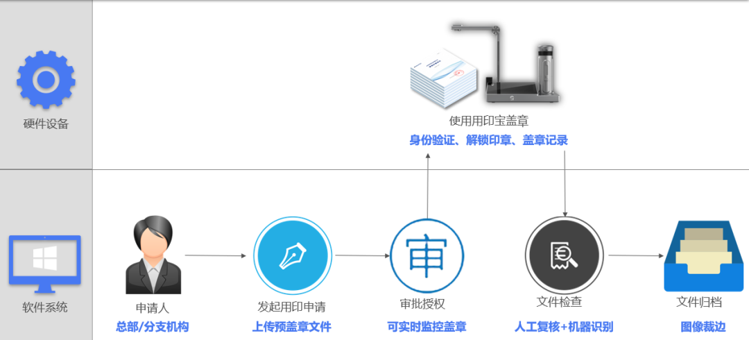 现在,在异地的分支机构的印章使用需要经过总部远程授权并接受监控才能使用。