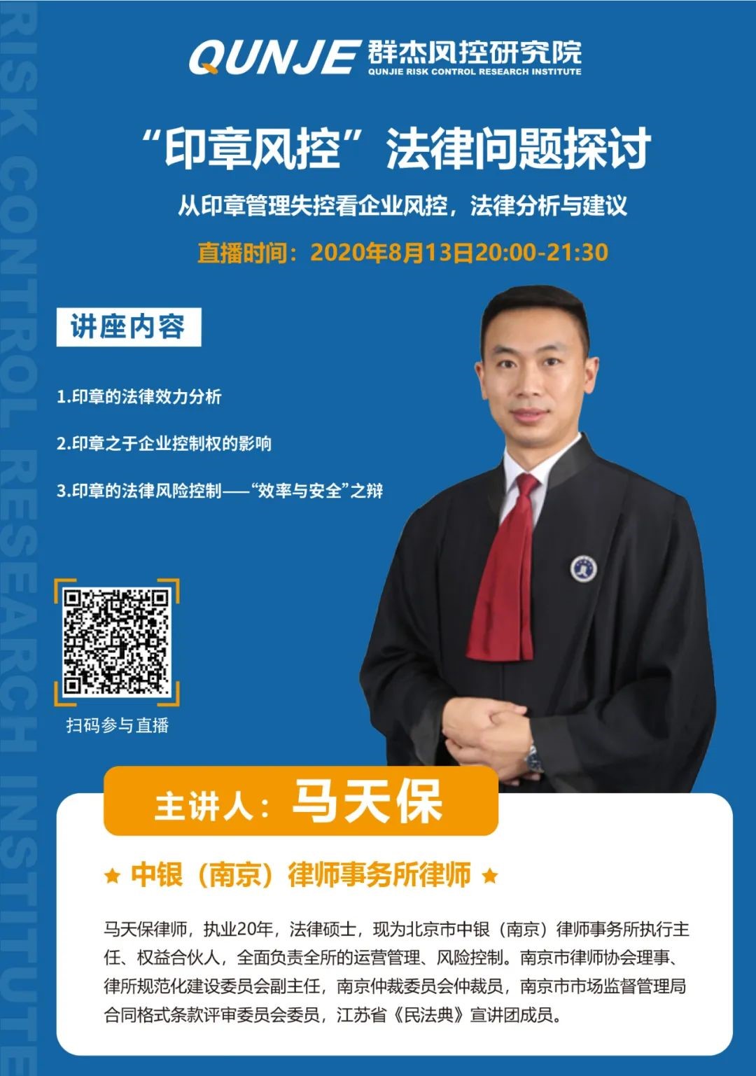 企业印章究竟如何管控,对目前的商业环境和企业法律风险控制有哪些需要反思的地方?本期,群杰风控研究院邀请中银律师事务所法律专家马天保律师来聊聊公司纠纷背后的印章“迷城”。